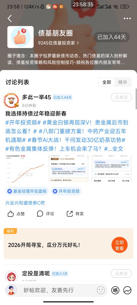 #开年投资顺# #春节AI大战!千问发动30亿奶茶功势# #八部门重磅方案!中药产业迎五年机遇期# #黄金白银再现深V!贵金属后市到底怎么看?# #有色金属集体反弹!上车机会来了马?# #美股存储概念股大涨:供应或持续短缺# 今年我就打算持债过年,选的是兴业兴和盛债券C(024307),跟大家说说我的想法,都是大白话,好懂。