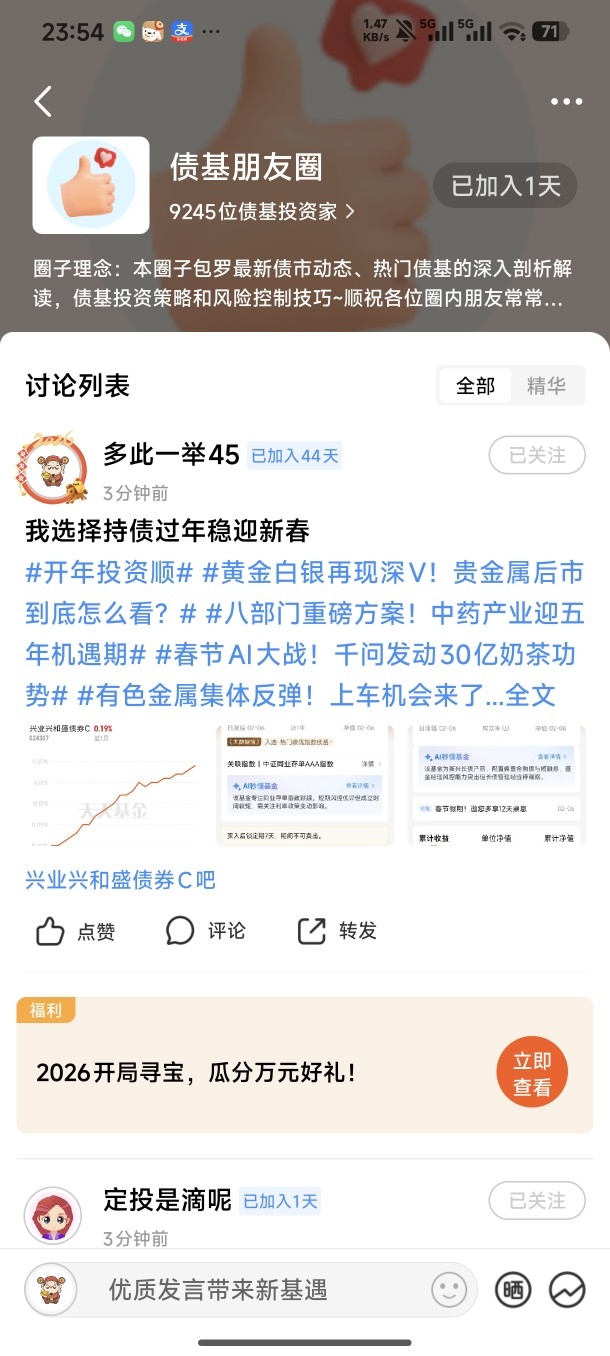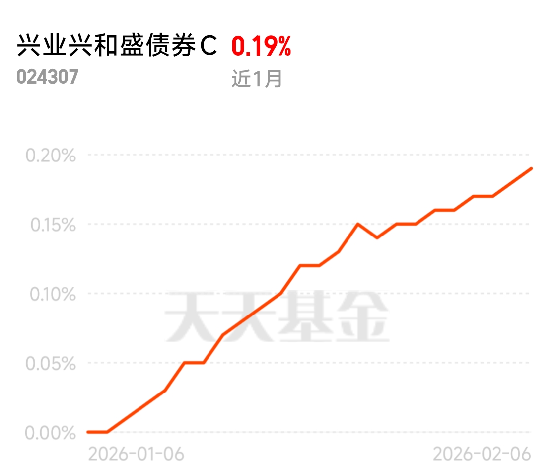 #开年投资顺# #春节AI大战!千问发动30亿奶茶功势# #八部门重磅方案!中药产业迎五年机遇期# #黄金白银再现深V!贵金属后市到底怎么看?# #有色金属集体反弹!上车机会来了马?# #4200点久攻不下 盘整十日何去何从?# 今年打算妥妥持债过年,市场震荡的大环境下,稳稳的幸福才最实在,选的就是兴业兴和盛债券C。这段时间股市波动大,不想拿着仓位提心吊胆过年,纯债基的低波动就特别适配当下的防御需求,这只基不投股票和可转债,专注债券投资,近3个月波动才0.69%,净值走势很平稳,作为账户压舱石再合适不过。而且它的费率也很亲民,C类0申购费,持有超7天还免赎回费,日常打理没什么额外成本。节前把闲置资金放这里,不用操心市场起伏,既能稳稳赚点票息收益,又能安心过年,等节后市场方向更明朗了再做其他规划。震荡市投资,先守好底仓再谈收益,持债过年就是我的新年投资小策略~$兴业兴和盛债券C$