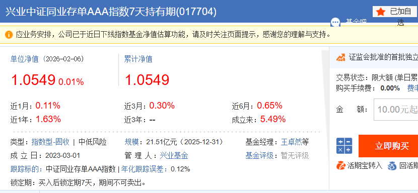 三、深度拆解第二只:兴业中证同业存单AAA指数7天持有期(017704)—— 极度稳健,适配春节,适合应急闲钱