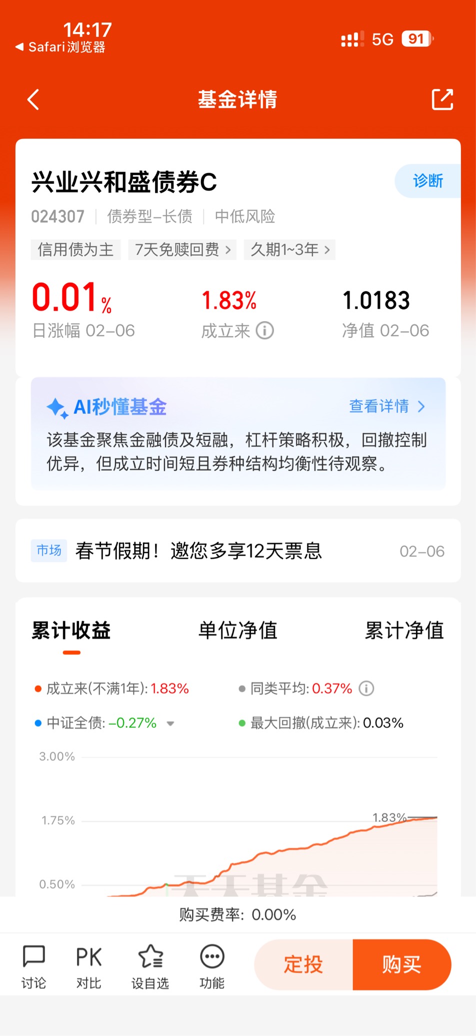 在众多债券基金中,我选择了我之前购买的兴业兴和盛债券这只债券基金在业绩表现上不仅业绩稳健,回撤控制良好,而且具有较高的流动性。C类份额满7天即可免赎回费的规定,让我在持有过程中感到无压力。近六个月,该基金的累计涨幅达到了1.65%,且在近期债券市场表现不佳的情况下,近三个月的回撤也控制得相当不错,为投资者取得0.73%的收益率。这些特点,让兴业兴和盛债券基金成为了我春节假期理财的理想选择。