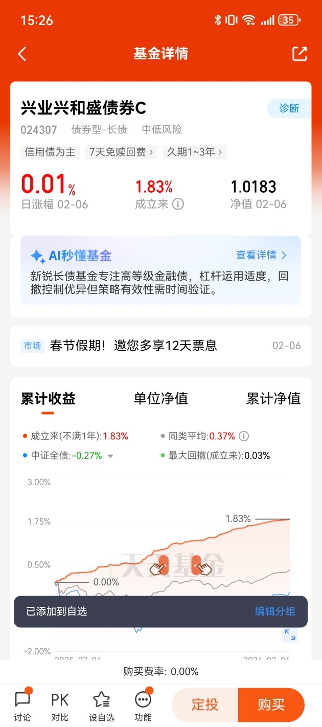 操作也简单到不行。不管是支付宝、微信理财通,还是手机银行APP,搜“兴业兴和盛债券”就能买,1块钱就能起投,几百、几千、几万都能放进去。买完就不用管了,安心过年走亲戚、吃年夜饭,节后2月24日就能赎回,钱随时能用,既不耽误花钱,又能多赚一笔,这不就是稳稳的幸福嘛!
