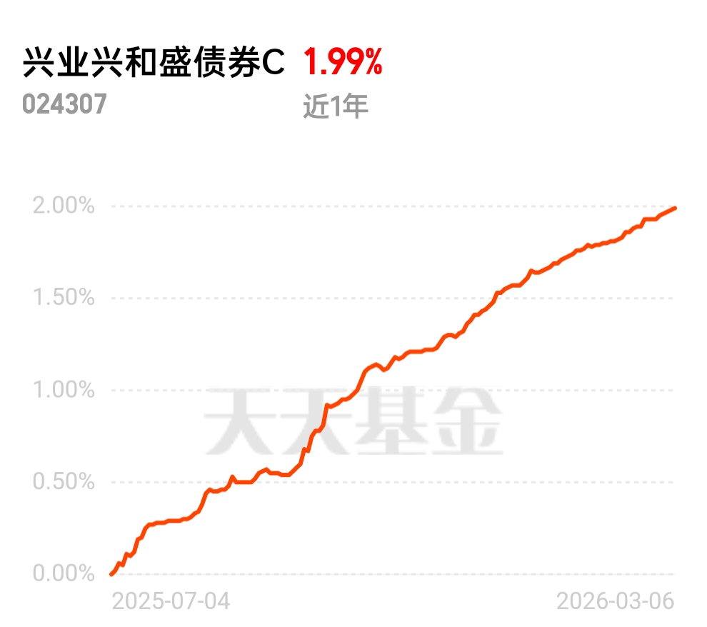 总而言之,2026年宽松货币政策为债市保驾护航,信用债策略成为纯债投资的最优解。告别2025年股债跷跷板的收益困境,以$兴业兴和盛债券C$为代表的信用债纯债基金,凭借稳定票息、净值稳步上行的核心优势,在当前债市行情中脱颖而出。对于追求稳健的投资者来说,把握宽松周期下的信用债配置机遇,选择优质信用债基金,便是守住理财收益、实现资产平稳增值的关键。