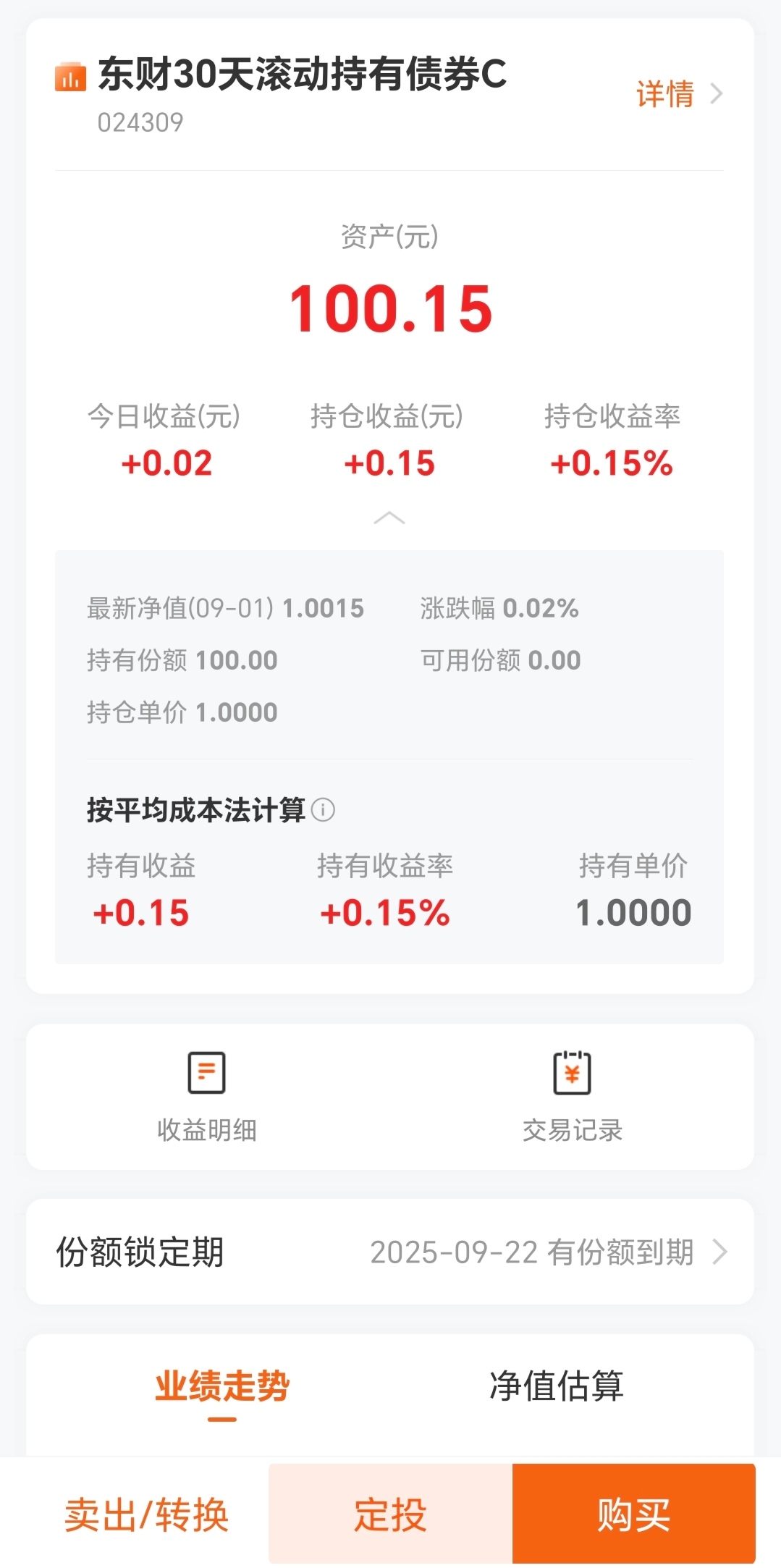 $东财30天滚动持有债券发起式C(OTCFUND|024309)$ 很垃圾的基金,还好就试试水投了100块,拿了一个多月今天想起来了有这个基金,上来一看,收益率0.15%