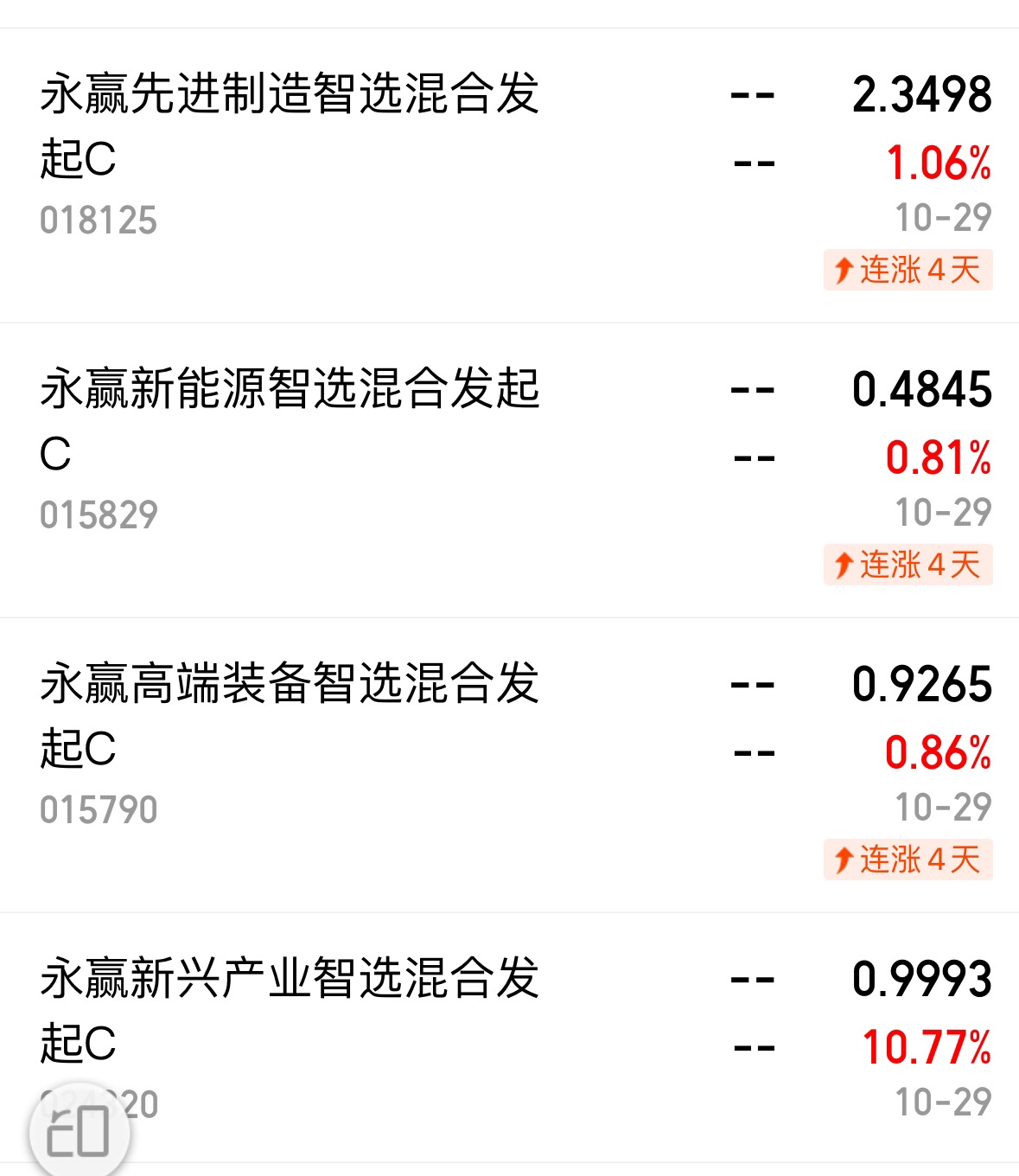 看看永赢家族今天整体走势:今天一路收红呀,关注到一个新秀$永赢新兴产业智选混合发起C$ 新兴产业今天收10.77%,优于同类,它主要关注北交所,追求比指数更高弹性。$永赢先进制造智选混合发起C$ 先进制造收1.06%近6个月收23.53%表现优秀。$永赢新能源智选混合发起C$ 新能源收0.81%近3个月收27.37%表现不错。$永赢高端装备智选混合发起C$ 高端制造收0.86%近3个月收11.13%还有发展空间。从各个阶段来看这些还是比较给力的,产品有医疗创新,机器人,新能源,光刻机等等!希望后面走势更好哈!这些基本都是潜力股呀,可以加关注起来了!