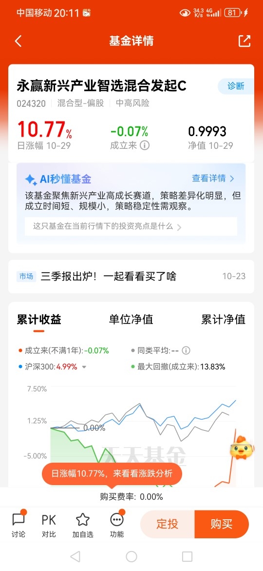 $永赢新兴产业智选混合发起C$ 重点布局电子、电力设备、汽车等高成长赛道,行业集中度较高,与科技创新周期关联密切。策略差异化特征: 基金经理注重产业链变革机会,偏好挖掘非龙头企业的成长潜力,投资风格具备一定独特性,今日上涨+10.77%,期待这基的表现呀。#10月基金投资策略#