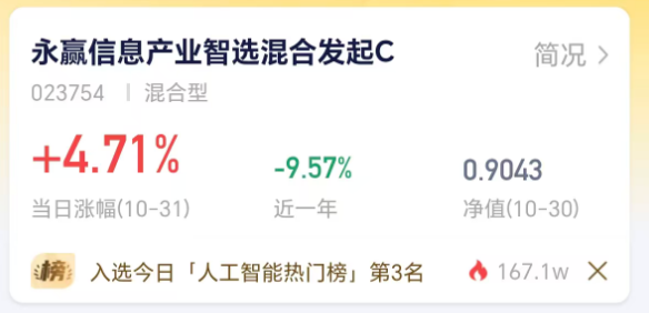 永赢新兴产业智选混合发起C(024320)精准把握了这波行情,其核心优势在于深度聚焦北交所赛道,并且区别于被动跟踪北证50指数的产品,该产品充分发挥永赢智选系列的主动选股特长。被动指数产品只能机械跟随指数成分股变动,而这只产品的基金经理能够根据市场变化灵活调整持仓,深入挖掘北交所中被低估的优质企业。比如在近期表现突出的高端装备、信息技术等领域,通过主动筛选研发实力强、订单充足的企业,从而实现了比指数更高的弹性,这也是其能在单日斩获10.77%涨幅的关键原因。