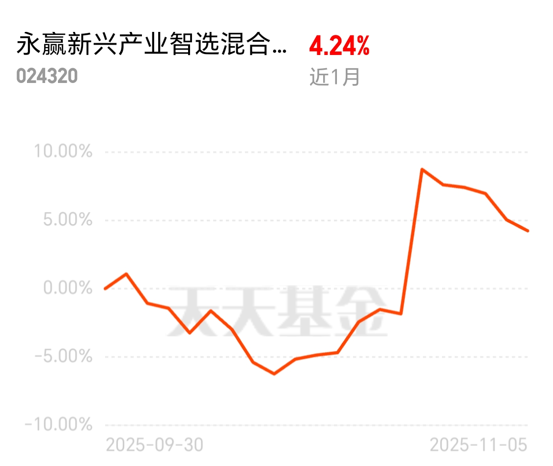 $永赢新兴产业智选混合发起C$ 主要聚焦电子、计算机、汽车等新兴产业赛道,行业分布契合科技创新与产业升级方向看业绩,近一月涨4.29%,10月29日单日涨幅超过10%,成立不到二个月,收益优于同类均值。目前看,行情有起飞迹象,我准买点试试。$永赢新兴产业智选混合发起C$