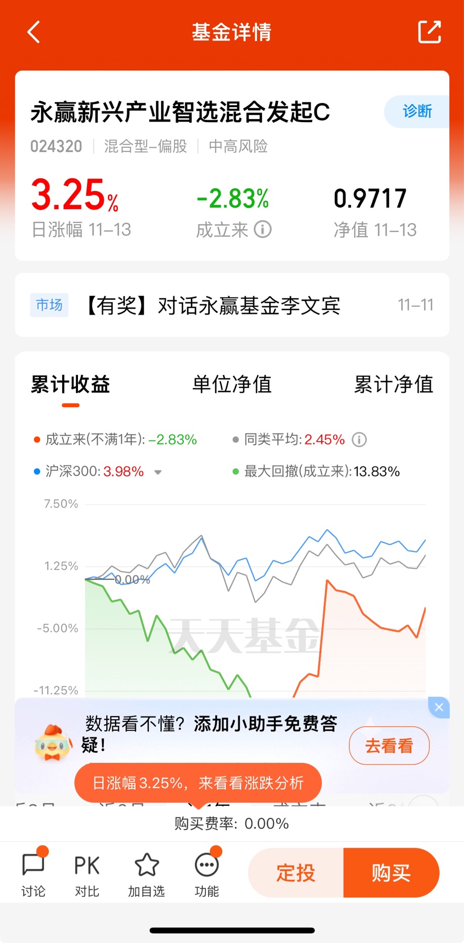 $永赢新兴产业智选混合发起C$昨天收3.25%,近一个月收7.26%,表现优秀!