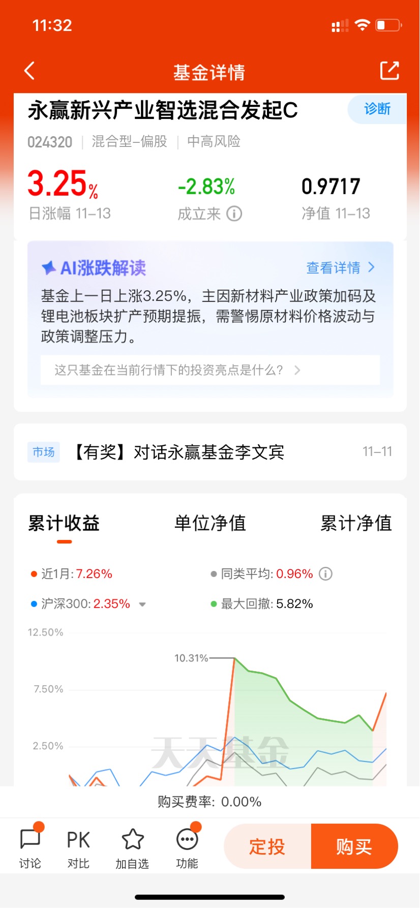 $永赢新兴产业智选混合发起C$ 昨天涨了3.25%,近期虽有调整,但在同类中表现还是比较优秀的,是个抗波动能力不错的基金!永赢新兴产业智选关注新兴产业领域投资机会,聚焦北交所以新质生产力为代表的中小市值成长型资产,中长期来看,成长空间较大,目前估值低位,值得继续期待了!#科技热点摊开业啦#