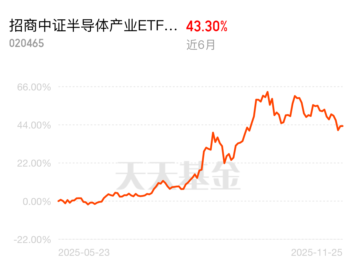 A股今天科技氛围浓厚,半导体板块领涨全场,短期有国内GPU第一股摩尔线程开启申购的利好。招商中证半导体产业ETF联接C顺势上涨,近6个月收获43.30%的收益,长期来看中芯国际、华虹半导体产能利用率持续高企,行业需求有保障。