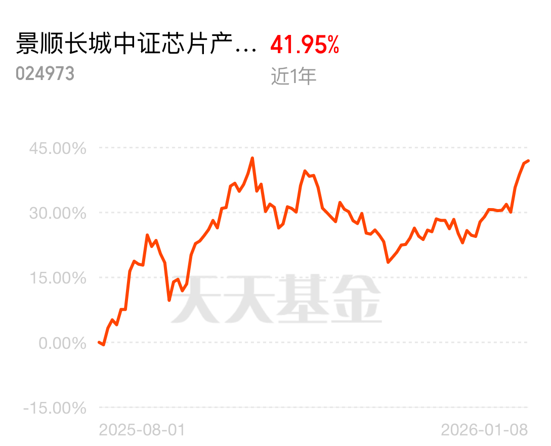 国产半导体设备企业百舸争流,政策扶持力度加大,存储芯片涨价潮刚启动,业绩同步增长。替代率才 20%,景顺长城中证芯片产业 ETF 联接 C 近 1 月 10.45%,近一年涨超 41%,连续 4 连涨,重仓龙头稳稳跟涨。