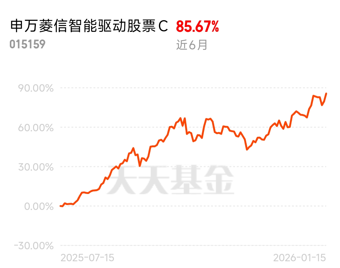 AI + 金融应用落地,带动半导体需求,板块行情持续火热。$申万菱信智能驱动股票C$ 近 6 月涨幅 85.67%,重点布局半导体方向,顺着东风持续上涨,今天估值已近 3 个点,各阶段表现都很突出,成长潜力让人放心。