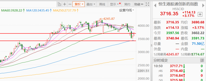 从技术面看,恒生港股通创新药指数虽然击穿前期构筑的箱体下沿,但第二强支撑并未跌穿,目前看也是有所抵抗的,今天日K更是收复5日线,不排除会在这儿止跌展开新一轮的反弹。