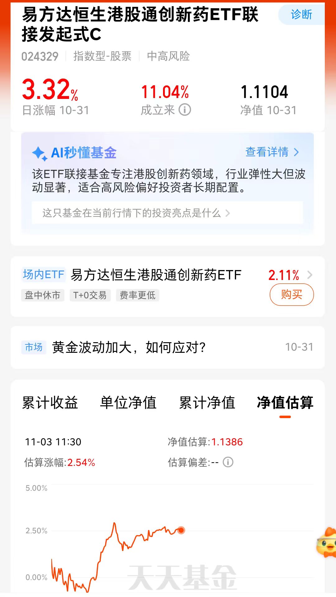 伙伴们,今年以来创新药赛道就接连上涨了好几次,从8月份开始回调就有点淡出大家视线了,但是我觉得产业基本面确实没有发生变化,回调也是属于快速上涨后的正常调整(BD交易淡季、地缘政治担忧),但目前产业趋势依然稳固,这不涨势又回归了嘛,我觉得可以低吸$易方达恒生港股通创新药ETF联接发起式C(OTCFUND|024329)$他反弹能力强,上周五就反弹了3.32%,今天盘中估值上涨2.54%。