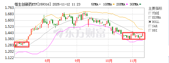 1、从技术走势上看,$易方达恒生港股通创新药ETF联接发起式C(OTCFUND|024329)$这基跟踪的恒生创新药,经历了8-10月份的震荡之后,对前期涨幅进行了消化。同时,在布林轨的下方线获得强有力支撑,筑底迹象非常明显了。相对于7月份的底部,11月份的底部有稍微抬升了一点,也可以说是二次底部区域,目前刚好处于右侧布局行情。
