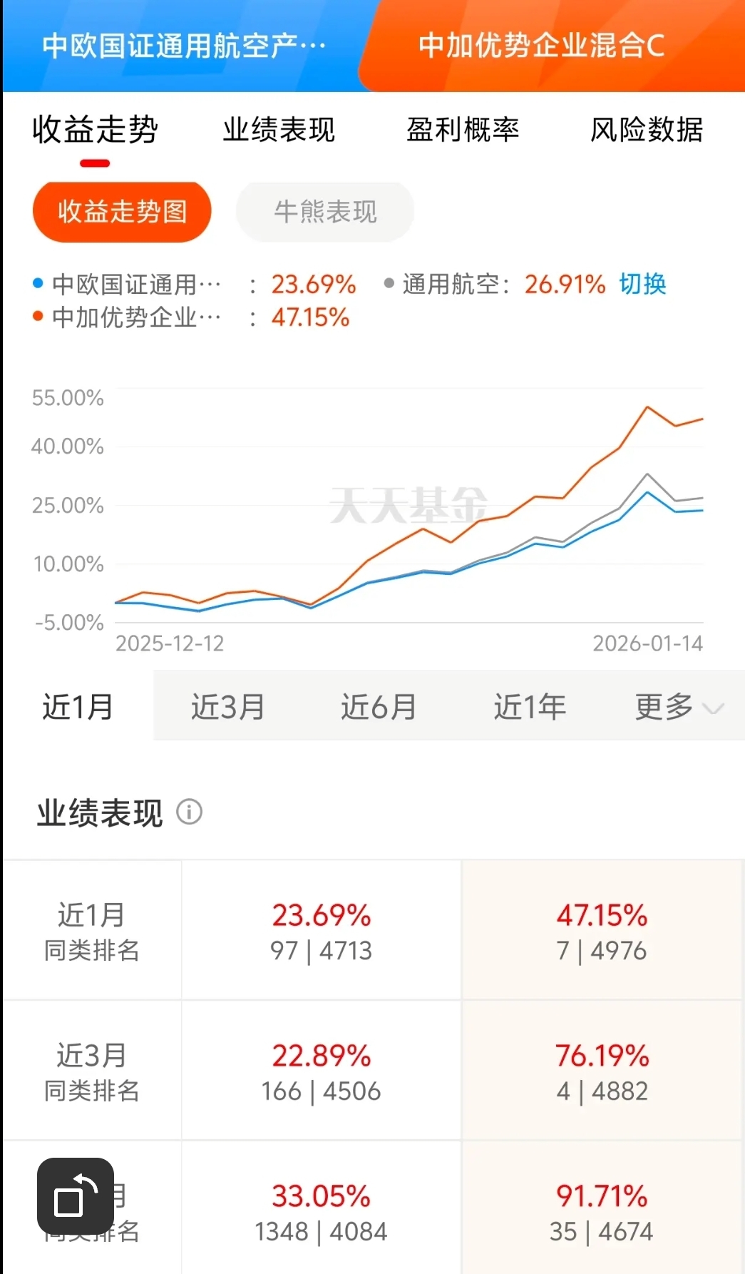 只看单日涨跌,只会徒增焦虑,比成绩得稍微拉长点时间!$中加优势企业混合C$ 近一个月47%+的涨幅,大幅超越了中欧国证通用航空这基一个月收益23%。结构性行情里,主动基金的优势就出来了。