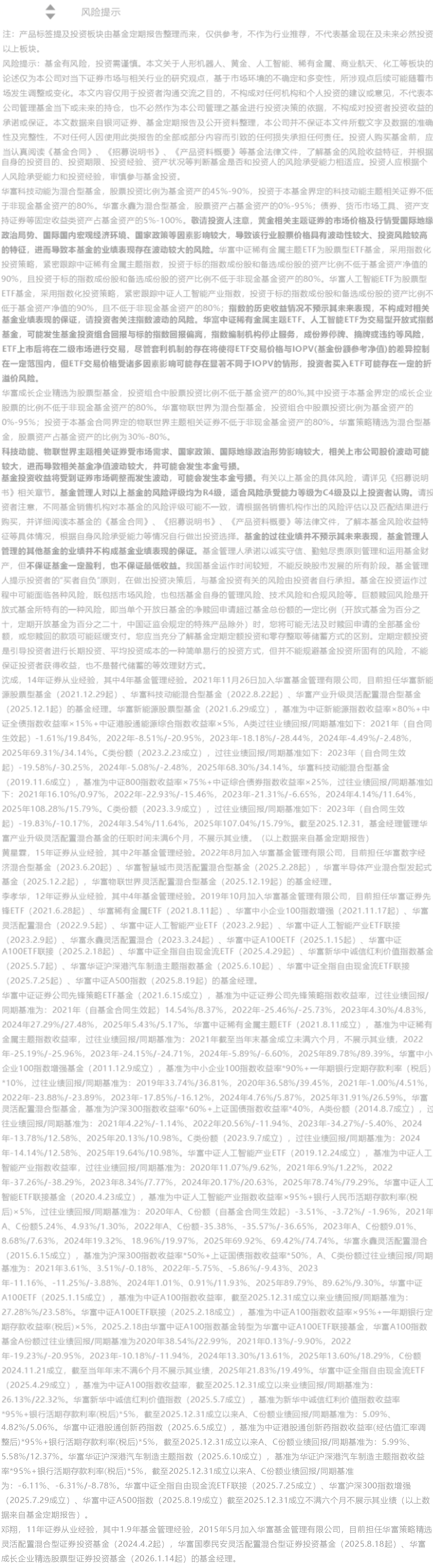 这只基金的策略非常明确——聚焦人形机器人板块。2025年,人形机器人领域迎来爆发式行情,华富科技动能A的精准布局,完整捕捉到了这波风口红利,2025年年度回报达到108.28%(同期基准涨幅15.79%),同类排名第三(3/219)。(数据来源:基金定期报告,统计区间为2025.1.1-2025.12.31。基金排名数据来自于银河证券基金研究中心,统计区间为2025.1.1-2025.12.31,银河分类为偏股型基金(股票上限95%)(A类)。排名发布日期2026.1.5。基金的过往业绩并不预示其未来表现,也不构成对基金管理人管理的其他基金业绩表现的保证。)