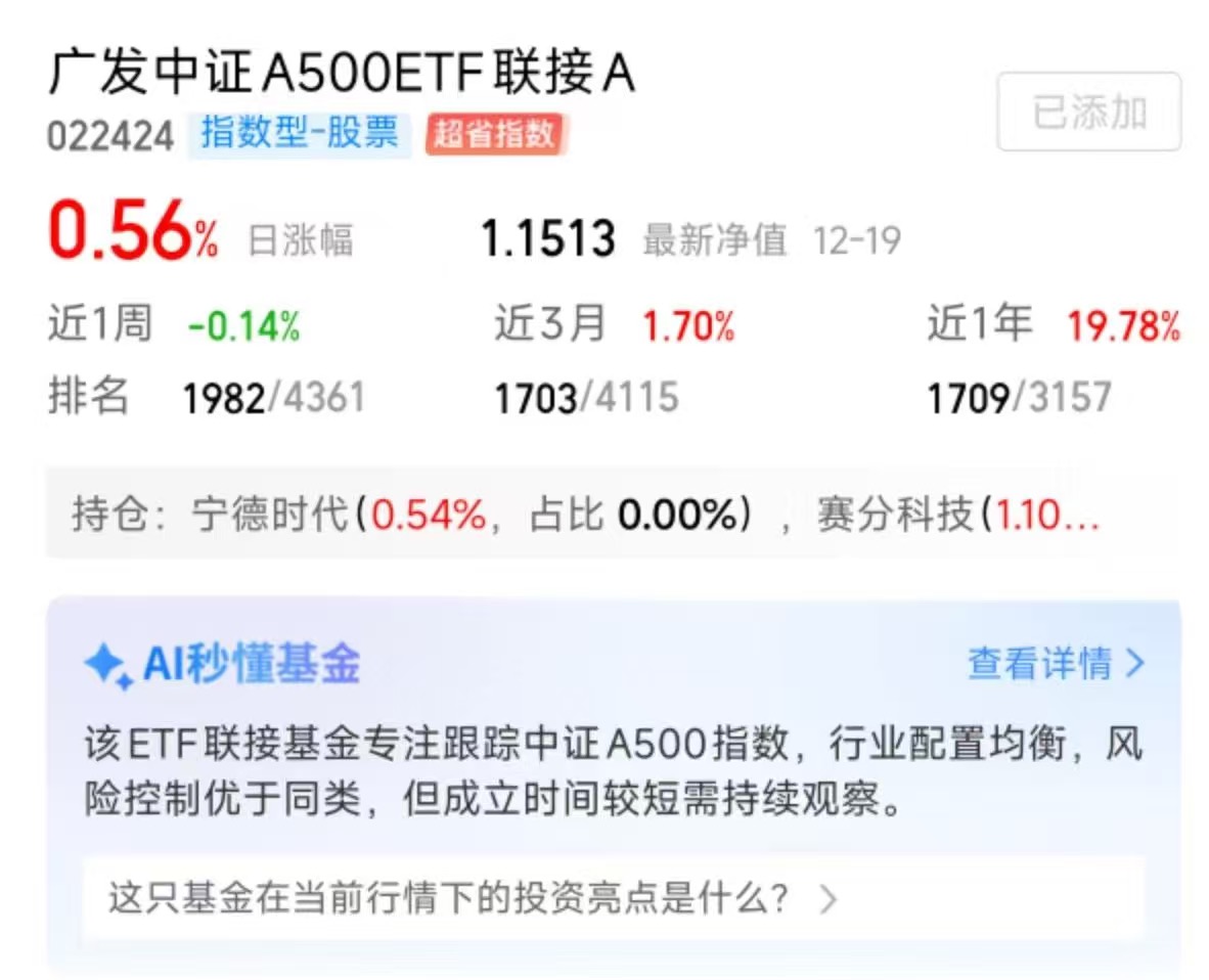 有没有人注意广发中证A500ETF联接A免申购费了?我前两天看还没有,好像是刚上的活动。买A类不收申购费的情况不多见,要是打算拿时间长一点,这个成本确实低$广发中证A500ETF联接A$
