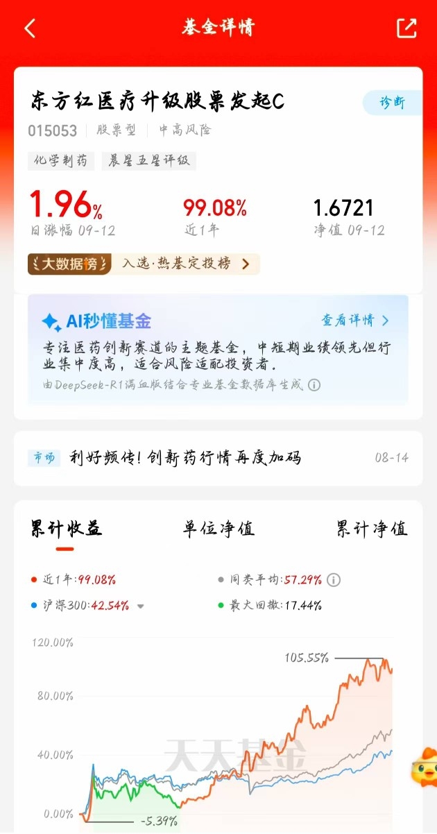 医疗主线地位巩固!东方红医疗升级超一月涨16.58%,上周五强劲反弹。AI赋能催化行业变革,估值低位果断加仓。