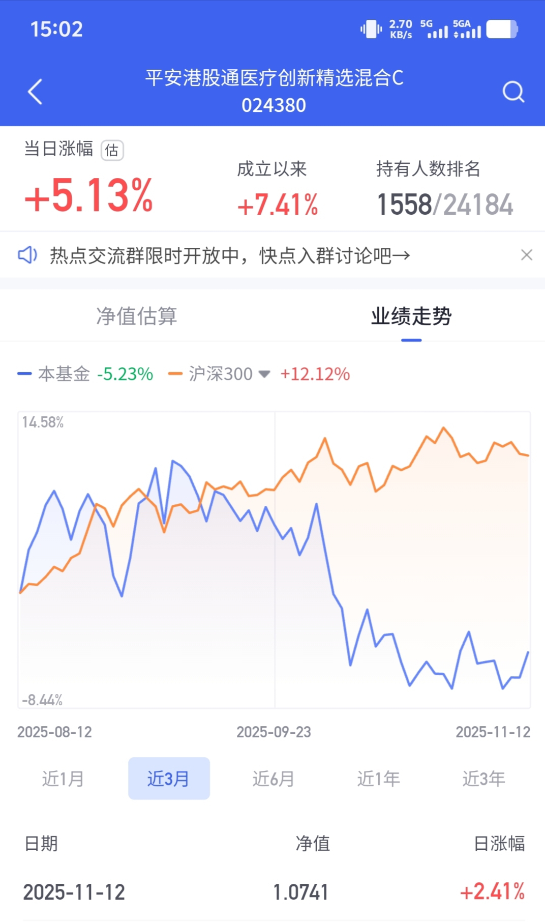 家人们,一觉醒来港股杀疯了!当今市场板块化明显,港股中的创新药板块直接起飞!医疗板块前几天还市场震荡,这两天直接一步登天。太吓人了!$平安港股通医疗创新精选混合C$ 今日估值上涨5.13%!涨幅惊人,而且它昨日上涨2.41%,连涨两天,表现亮眼!