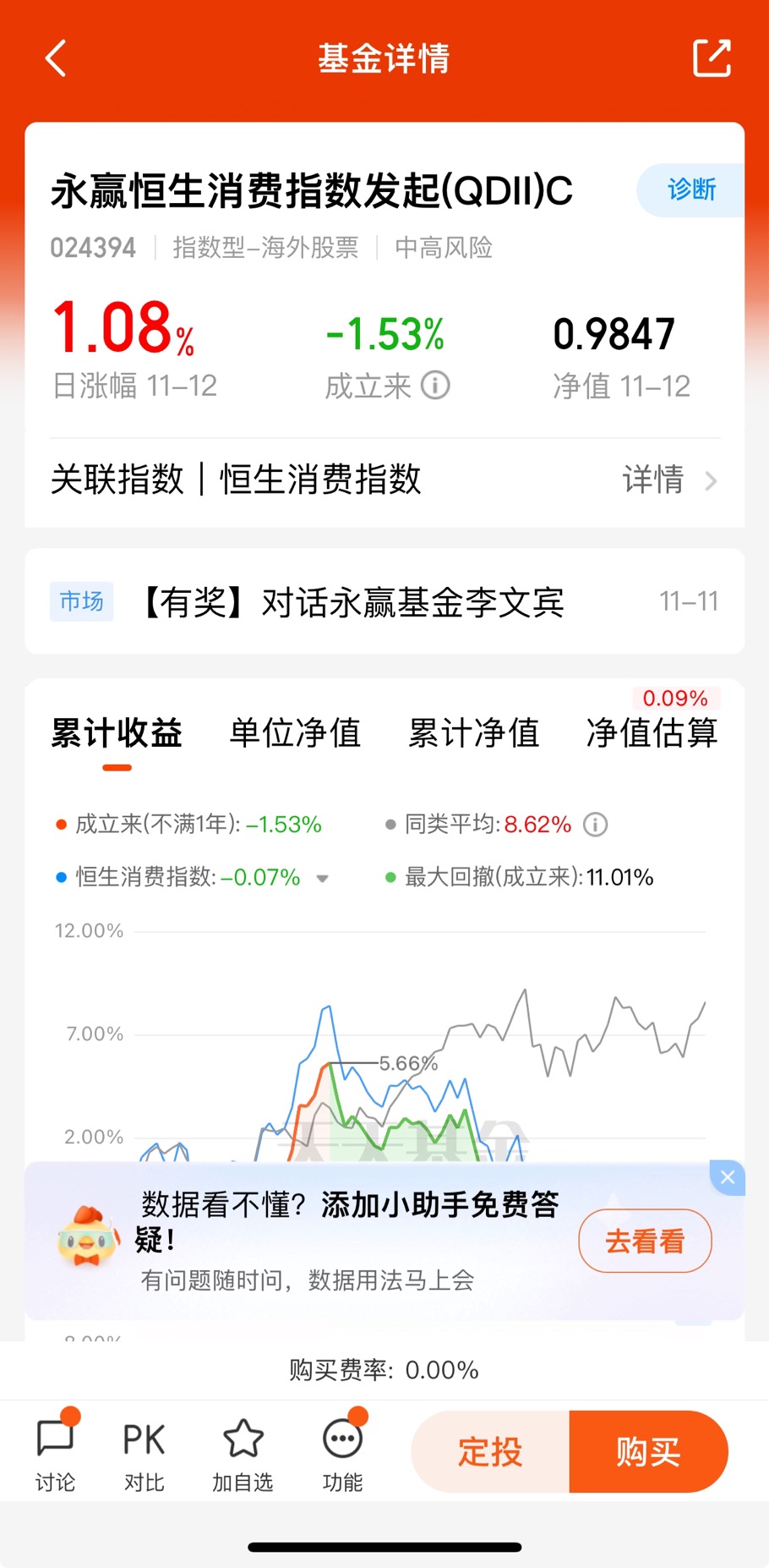 $永赢恒生消费指数发起(QDII)C$昨天收1.08%,近一周收4.67%,排名
