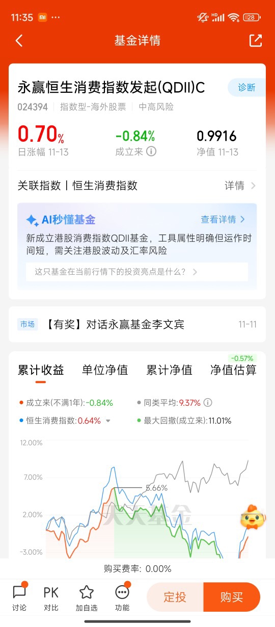#4000点 到底要不要止盈?# 恒生消费在左磷右锂热度催化下,迎来爆发潮。$永赢恒生消费指数发起(QDII)C$ 昨晚涨0.70%,连涨四天,近一周涨幅4.34%。估值处于历史低位,大资金持续流入,加上港股消费板块行业平均水平的盈利能力和增长韧性,四季度消费旺季,值得把握的配置良机!
