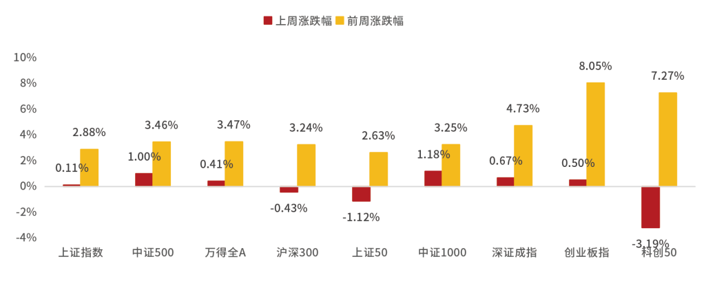 上周A股宽基指数涨跌不一。截至10月31日,中证1000上涨1.18%、中证500上涨1.00%、深证成指上涨0.67%,涨幅居前。从行业板块看,上周电力设备、有色、钢铁领涨,通信、美容护理、银行领跌。