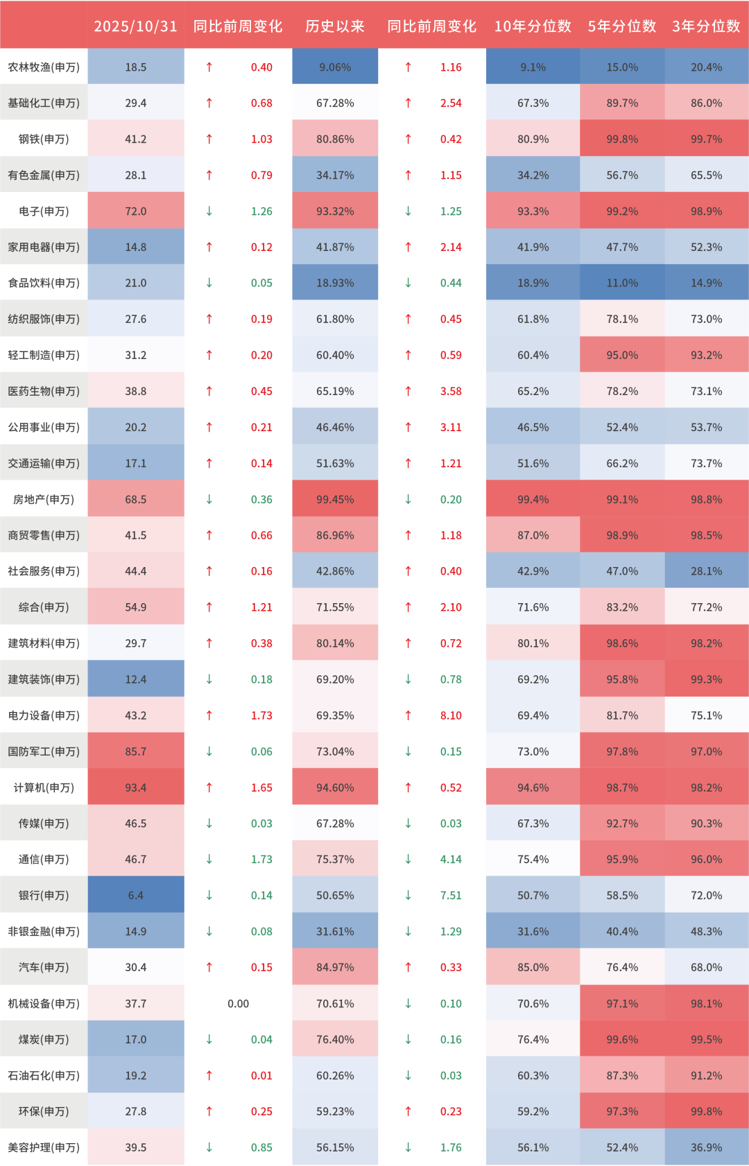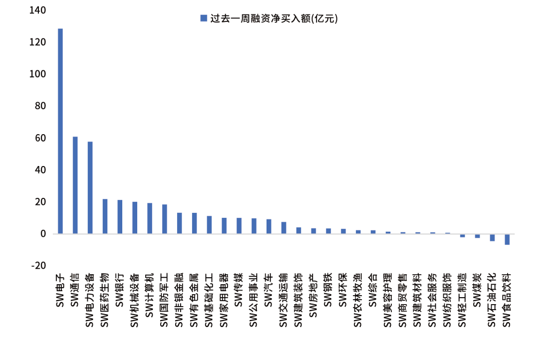 10月30日,两融资金占比为11.45%,10月24日为11.88%,反映出杠杆资金加仓意愿略有下降。截至10月31日,上周融资净买入的前三行业为电子、通信、电力设备。