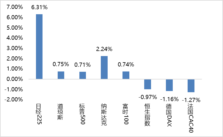 上周海外股市涨跌不一。美国股市方面,道指上涨0.75%,标普500上涨0.71%,纳指上涨2.24%;欧洲股市方面,英国富时100上涨0.74%,德国下跌1.16%,法国下跌1.27%;亚太股市方面,日经指数上涨6.31%,恒生指数下跌0.97%。