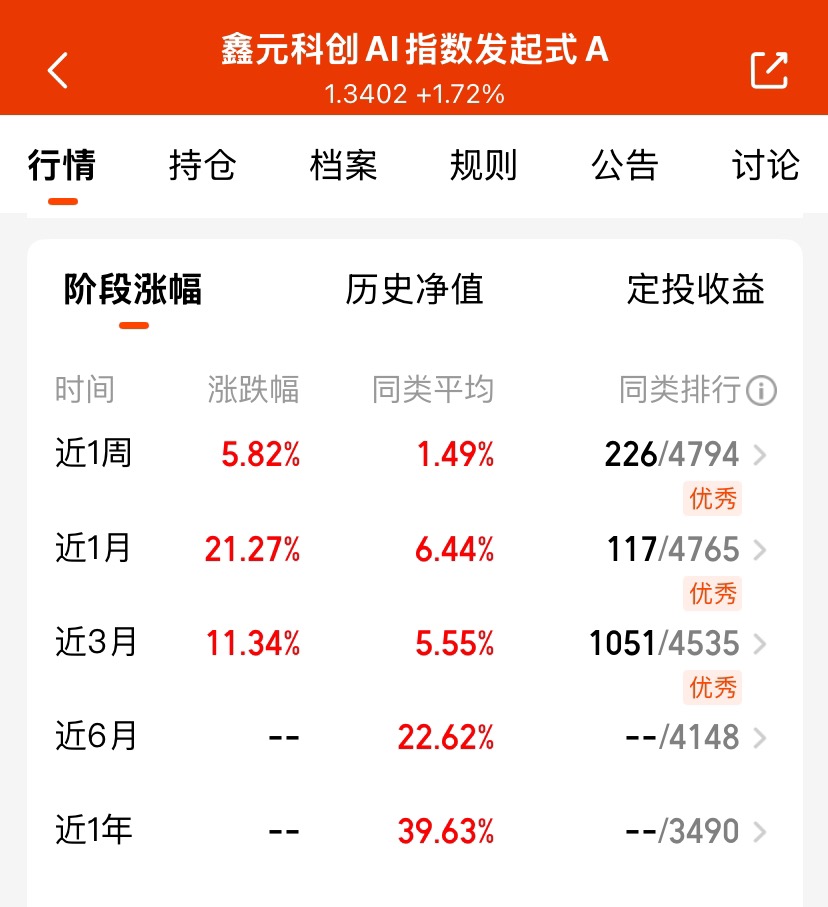 $鑫元科创AI指数发起式A$纯血科创AI赛道,日涨1.72%,近1个月收益21.