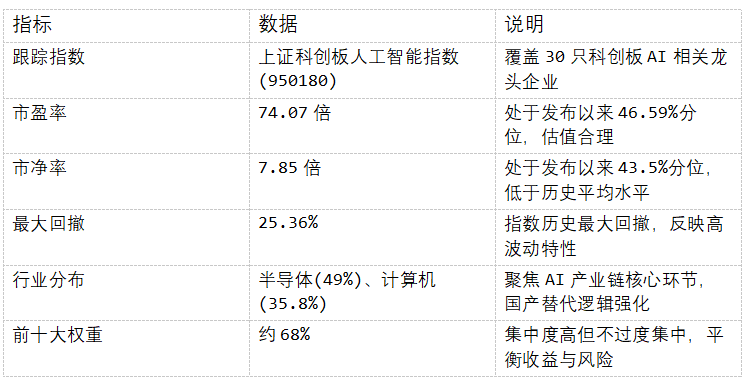 从产品设计来看,该基金作为发起式基金,要求基金管理人自购至少1000万元并锁定3年 ,体现了公司对产品的长期信心。基金跟踪上证科创板人工智能指数(950180),该指数从科创板选取30只市值较大且业务涉及人工智能的上市公司,前十大成分股合计权重约68%,集中度高但不过度集中,覆盖了半导体(49%)和计算机(35.8%)等核心领域 。费率方面,管理费仅0.5%,托管费0.1% ,显著低于同类主动型基金,降低了长期持有成本,适合长期布局AI赛道的投资者。
