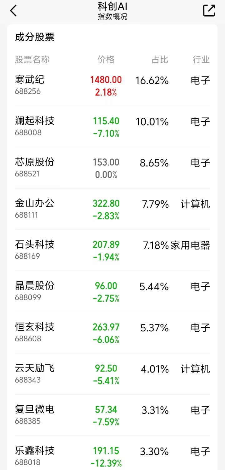 科创AI指数的成分股以龙头企业为主,同时包含高成长性企业。前十大成分股包括寒武纪(权重16.62%)、澜起科技(10.01%)、芯原股份(8.65%)、金山办公(7.79%)等核心企业 。从财务表现看,寒武纪2025年上半年营收达28.81亿元,同比增长4347.82%,实现扭亏为盈 ;澜起科技同期净利润11.59亿元,同比增长95.41% ,显示出强劲的成长性。然而,部分成分股也存在风险,如寒武纪存货增长51.64%(2025年6月30日) ,需关注库存积压风险。