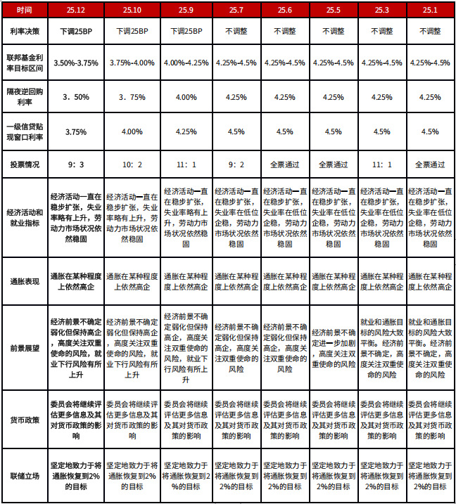 【联储政策与立场】关于利率和扩表: 联邦基金利率目标区间下调25个基点,至3.5%–3.75%,为连续第三次降息。常备隔夜回购利率(ON RP)由4.00%下调至3.75%,隔夜逆回购利率(RRP)由3.75%下调至3.50%。自2025年12月12日起启动短期美国国债购买,未来30天计划购买400亿美元;同时取消对常设隔夜回购操作的操作限制,未来储备管理购债速度可能“大幅降低”。根据最新公布的利率点阵图,共有12名官员认为应继续降息,较上次会议增加1人,另有7名官员倾向不再降息,其中3人甚至预测将转向加息。这使得点阵图中值显示的明年降息的次数仍为一次,与上次会议一致。美联储主席鲍威尔回应记者有关是否会“暂停降息”相关提问时表示,本次降息至3.5%-3.75%后,联邦基金利率已进入中性利率的广泛估计区间(bring our policy within a broad range of estimates of neutral),美联储将静观经济后续走势随时应变。关于通胀和就业:当前通胀超调主要由关税引起,属“一次性的价格上涨”,非持续性压力。若无新关税政策,商品通胀预计将于2026年第一季度见顶。非关税驱动的核心通胀已显著改善,今年在非关税相关领域已取得进展。就业增长显著放缓,失业率微升至4.40%(2025年9月)。技术性因素可能使近几个月就业数据被高估约6万个岗位,预计未来每月新增岗位将减少约2万个。失业率可能再上升0.1%–0.2%。人工智能可能是就业疲软的辅助因素,但非主因。关于经济:不认为经济过热,2026年基准前景为稳健增长。明年经济增长的回升主要因为第四季度政府关门导致经济活动暂时放缓,这部分增长将在明年一季度得到补偿:10–11月政府停摆对数据收集造成干扰,但停摆结束后,增长预期略有上修。