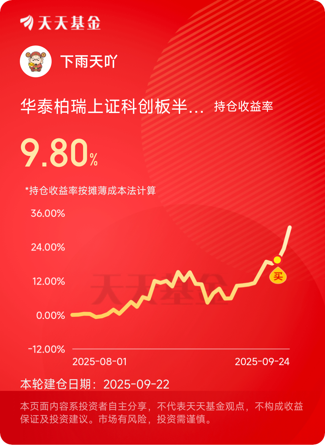 之前涨得少,现在半导体设备开始补涨了。$华泰柏瑞上证科创板半导体材料设备主题ETF发起式联接C$ 近一周收益13.81%,指数设备材料含量高,这波赶上了。