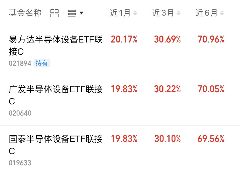 行情震荡回落,三大指数涨跌不一,板块分化明显。科技方向继续调整,半导体今天跌幅不小,但长期上涨趋势没变,完全不用慌。我看好的易方达半导体设备 ETF 联接 C,重仓中科技等龙头标的,年化收益率高达 80.84%,业绩相当亮眼。布局存储芯片概念,选半导体设备指数就对了,今天我逢跌上车,继续看涨这个赛道!