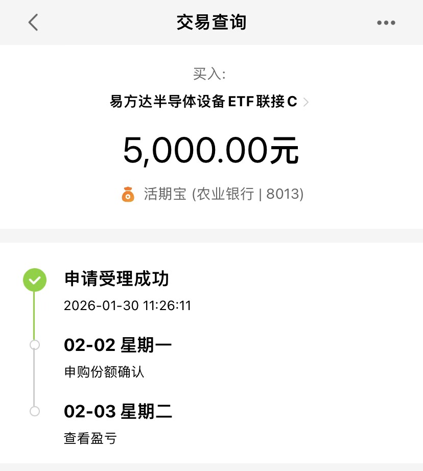 半导体设备是半导体赛道里质地更优的子板块,不仅弹性高,行情的持续性也更强,因此更受机构资金青睐。我手里持有的易方达半导体设备 ETF 联接 C 表现不错,目前持有收益可观,即便行情有所回落,也在我的本次加仓计划中。