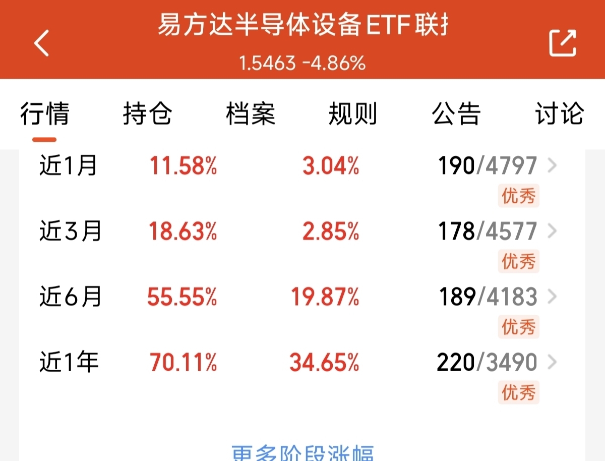 虽然最近的半导体出现了回落,但是目前全球半导体涨价潮还在继续。高盛预测今年的存储芯片涨价超90%。美股半导体存储芯片集体上涨,就这个外围半导体的上涨。今天的半导体也开始企稳。而且随着全球半导体芯片产能的提升,半导体设备的增长空间依然比较大。易方达半导体设备这支聚焦半导体上游产业链的指数基金。虽然经过短期回调,但是近一年依然上涨了70.11%,长期表现的稳定性一直不错。目前位置在低位,我继续收集低位筹码。