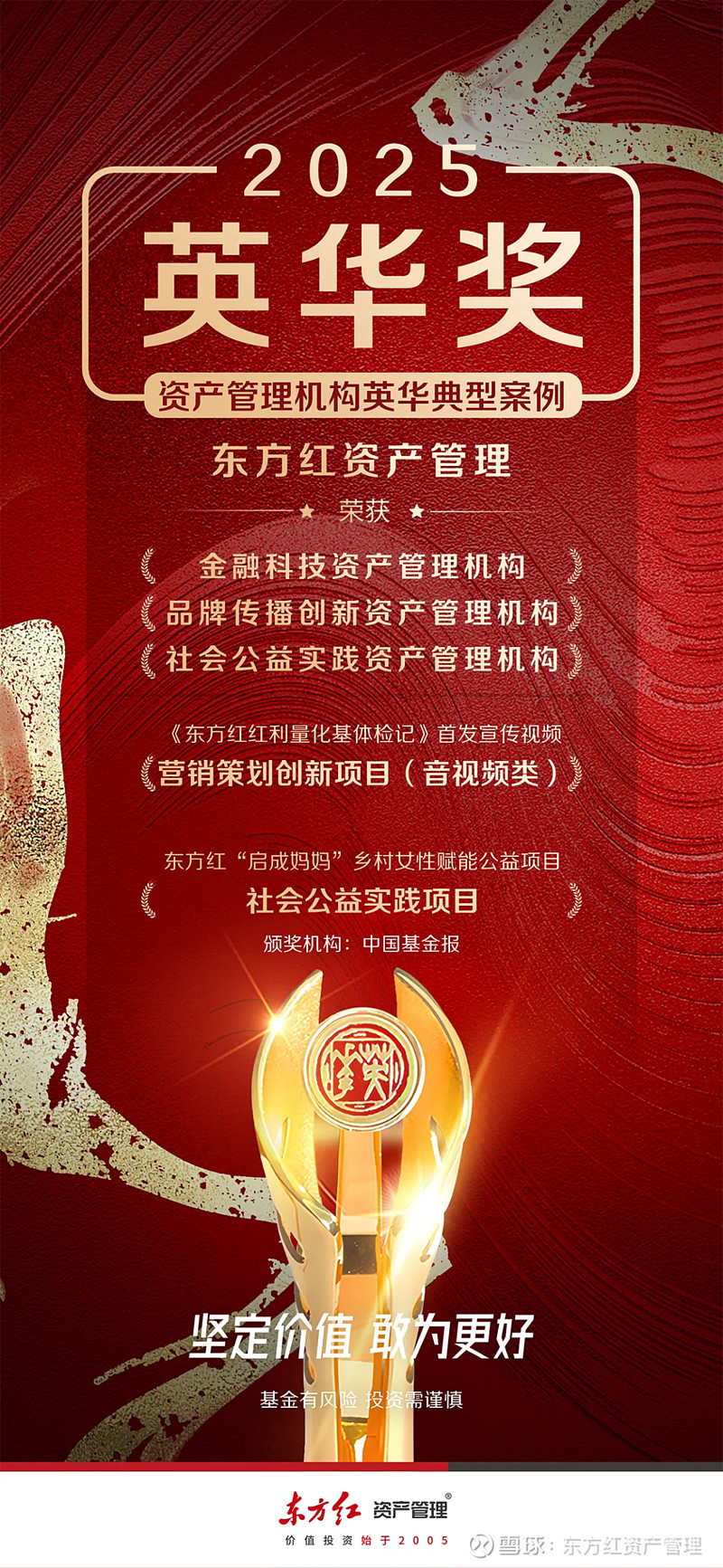 由中国基金报主办的“英华奖”系列评选已成为国内资产管理行业最具影响力的金融活动之一。东方红资产管理公司多次荣获该奖项,涵盖权益、固收、品牌营销、公益等多个领域。在2025年的评选中,公司一举斩获包含“金融科技资产管理机构”奖、“品牌传播创新资产管理机构”奖、“社会公益实践资产管理机构”奖等在内的五大行业奖项。自2017年以来,东方红资产管理公司已累计捧得45座“英华奖”奖杯,充分证明了公司在资产管理行业的领先地位。