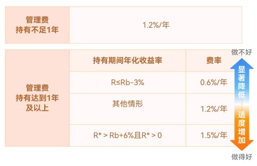 低档费率:若基金在持有期内收益率低于或等于业绩比较基准3%及以上,按每年最高仅能收取0.6%的管理费。