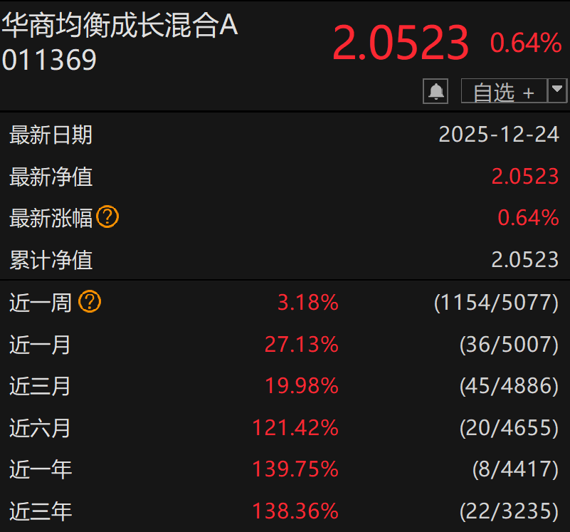 张明昕的投资能力不仅体现在华商致远回报上,其管理的另一只产品——$华商均衡成长混合A$(011369)同样表现优异。截至2025年12月24日,华商均衡成长混合A今年以来净值增长率高达139.75%,近一年、近三年业绩排名双双位列同类前十,为投资者在复杂多变的市场中带来了较好的持有体验。银河证券数据显示,截至2025年11月末,华商均衡成长混合C近1年、3年业绩排名双双位列同类第七,展现出强大的投资实力。自2025年3月4日张明昕接管该基金以来,截至2025年12月24日,基金收益已翻倍,同类基金排名前1%,相对基准的超额收益70%以上,高收益带来可观的夏普比,基金近一季夏普比达3.41,自基金经理接管以来夏普比也在3以上。