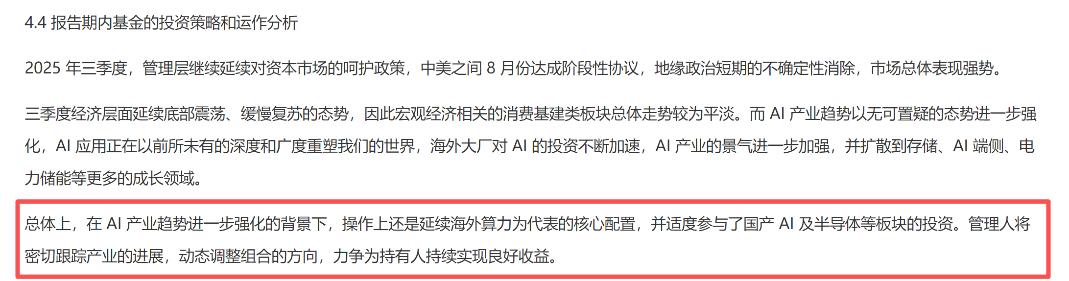 $华商均衡成长混合A$(011369)能取得如此卓越的业绩,根源在于基金经理张明昕对科技板块,特别是AI算力领域的精准前瞻布局与果断重仓。根据该基金2025年第三季度报告,张明昕在报告中明确表示,他在"板块处于底部且产业出现明显边际变化的时刻重仓了海外AI算力为代表的科技板块"。这种前瞻性的投资策略,让基金在市场底部区域成功捕捉到了AI算力板块的上涨机会,为投资者创造了可观的超额收益。经过多年的打磨,张明昕逐渐形成了"基于产业趋势的景气投资"这一核心投资理念,他认为全面的价值评估与合理的价格提供了较好的安全边际,这是投资的前提和根本;只有处于景气周期向上的行业才能够不断走出新高,通过全面的跨行业比较及深入的产业链研究,寻找能够戴维斯双击的阿尔法标的是获取投资业绩重要的保障。