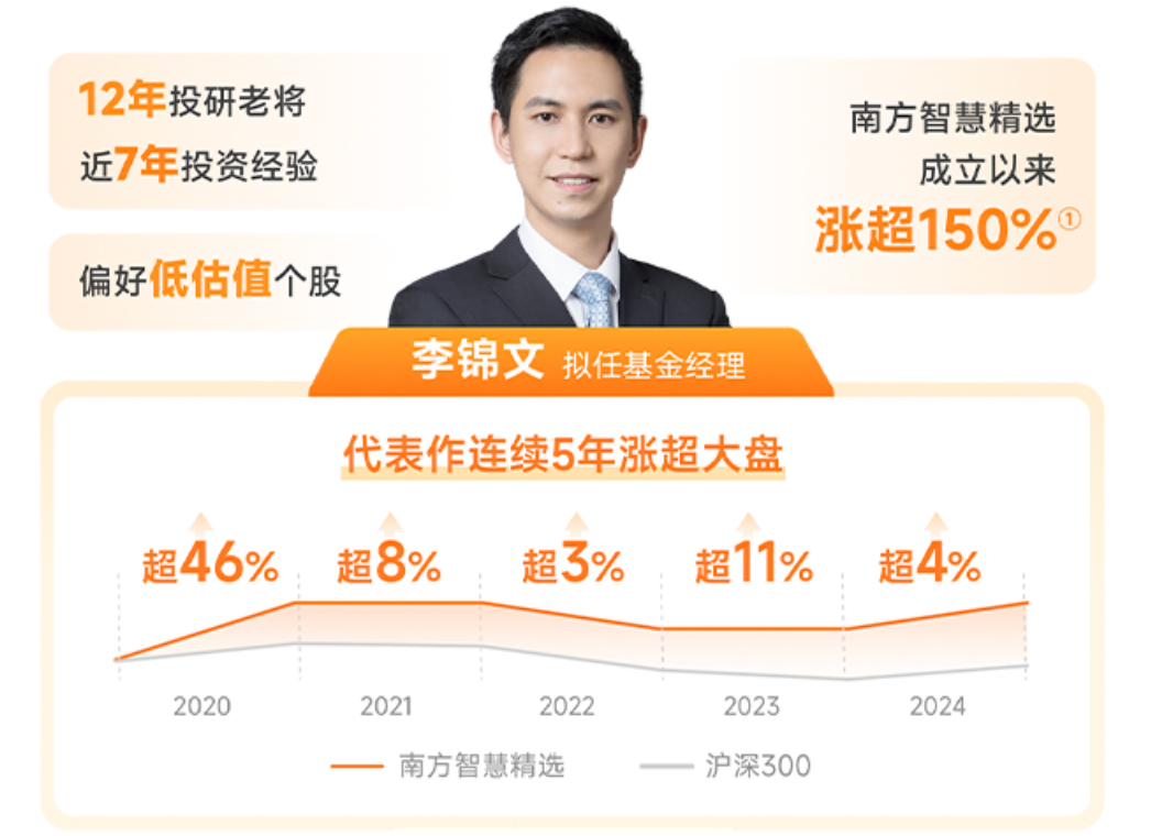 前面说过了,这种浮动基金最看基金经理能力,本基金由南方基金李锦文执掌,这位拥有14年投研经验的"双十"基金经理(从业超10年、年化回报超10%),以"价值成长平衡术"闻名业界。其管理的旗舰产品南方智慧精选成立以来涨超150%,连续5年超大盘,最大回撤控制优于同类均值30%,说明整体的选股实力还是很靠谱的。