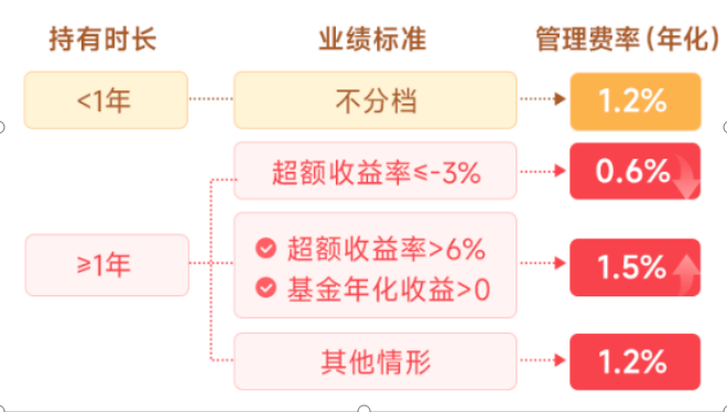 看了一下浮动机制,第一年不分档1.2%,这时基本都是建仓期,业绩浮动会比较大,这也合理;第二年开始就业绩考核了,要超业绩比较基准6%,而且是正收益,才收取1.5%的管理费,这也是现在大部分公募基金的标准;年化基准-3%≤收益≤基准+6%,执行1.2%标准费率,若收益<基准-3%,管理费直降50%至0.6%。