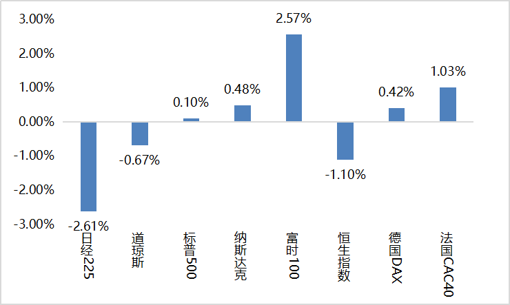 上周海外股市集体上涨。美国股市方面,道指下跌0.67%,标普500上涨0.10%,纳指上涨0.48%;欧洲股市方面,英国富时100上涨2.57%,德国上涨0.42%,法国上涨1.03%;亚太股市方面,日经指数下跌2.61%,恒生指数下跌1.10%。