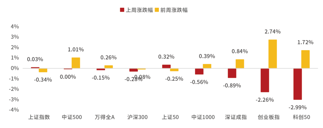上周A股宽基指数多数下跌。截至12月19日,科创50下跌2.99%、创业板指下跌2.26%、深证成指下跌0.89%,跌幅居前。从行业板块看,上周商贸零售、非银金融、美容护理领涨,电子、电力设备、机械设备领跌。