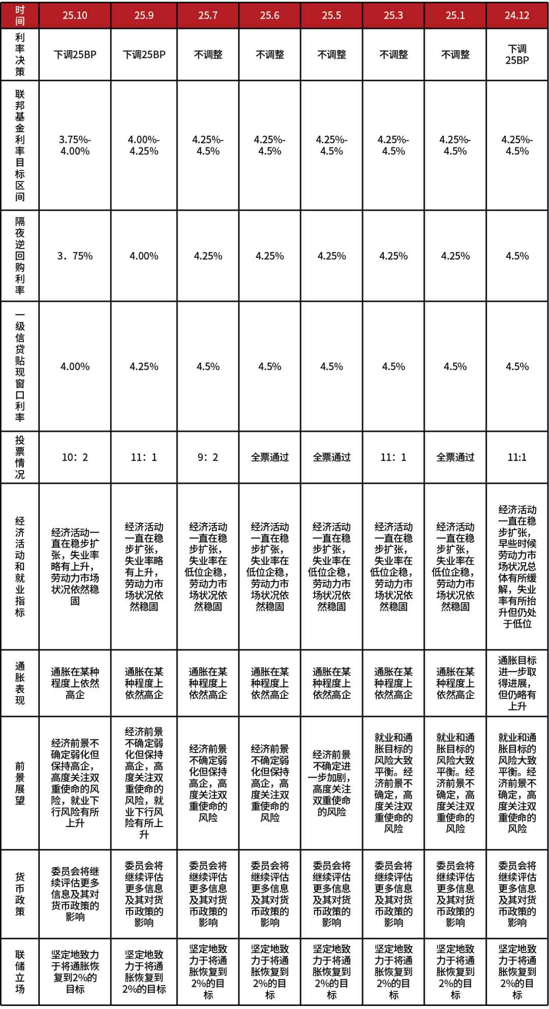 【事件】美联储10月议息会议决定,将联邦基金利率目标区间下调25个基点至3.75%-4.00%,为年内第二次降息,符合市场预期。美联储理事米兰再次投了反对票,他希望美联储更快地降息50个基点。堪萨斯城联邦储备银行行长施密德与米兰一样持反对意见,但理由相反——他更希望美联储根本不降息。在9月份的会议上,官员们暗示今年可能会三次降息。美联储将于12月再次召开会议。然而美联储主席鲍威尔警告称,不要认为下次会议上降息是板上钉钉的事情。美联储官员中“越来越多的人一致认为”,在再次降息之前“至少要等一个周期”。