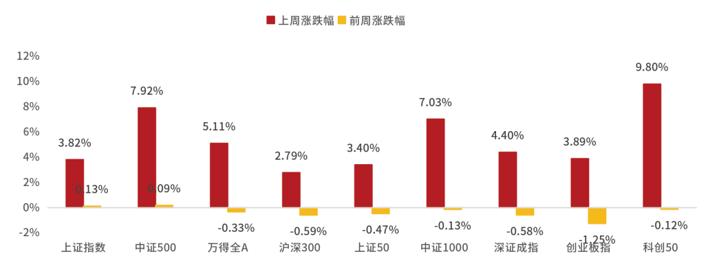 上周A股宽基指数大幅上涨。上证指数上涨3.82%,万得全A上涨5.11%,沪深300上涨2.79%,创业板指上涨3.89%,科创50上涨9.80%。从行业板块看,上周国防军工、传媒、有色金属领涨,银行领跌。