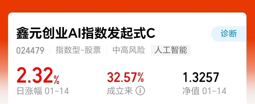 创业板AI赛道迎来发展机遇,$鑫元创业AI指数发起式C$ 通过指数复制精准跟踪板块,今晚斩获2.32%涨幅,低门槛特性让小资金也能分享AI成长收益。