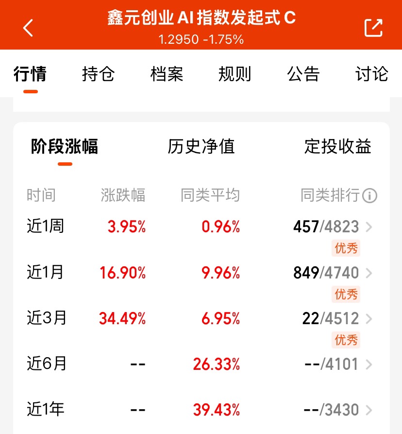 $鑫元创业AI指数发起式C$太绝了!最新净值1.2950,近3个月狂涨34.49