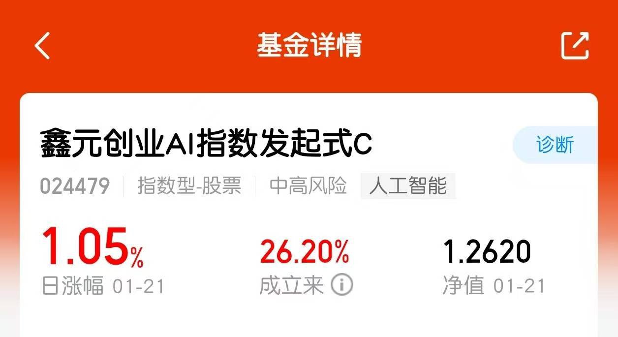 鑫元创业AI指数C(024479)今天又涨了1.05%,成立以来已经涨了26.2